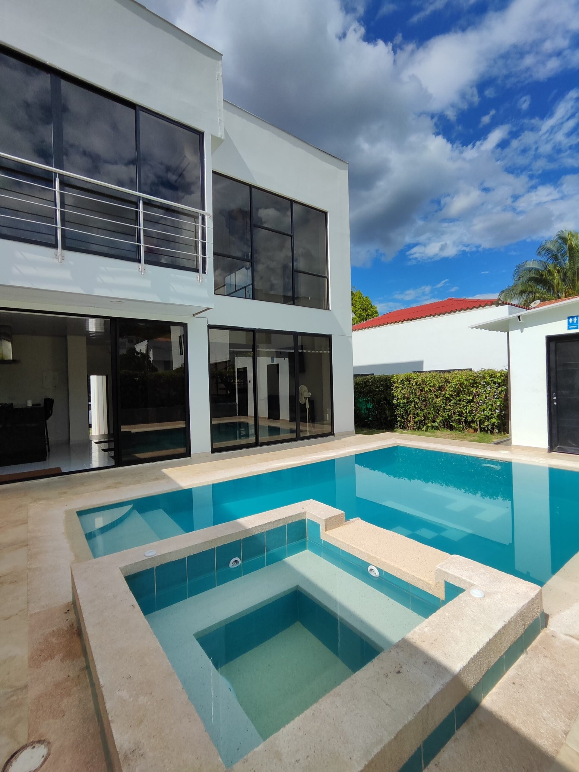 Villa privada de arquitectura mediterránea contemporánea. Mini Cine privado para ver películas desde la piscina. Ubicada en condominio campestre seguridad privada 24 horas , piscina y jacuzzi privado, Suite con Smart TV, Walking Closet, vista a la piscina, Baño privado, BBQ, Cocina integral, llegada autónoma , comedor exterior, wifi de alta velocidad, Minibar, Sala de doble altura con Smart Tv y ventilación con vista a la piscina, parqueadero privado.